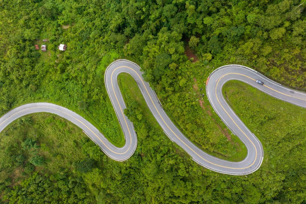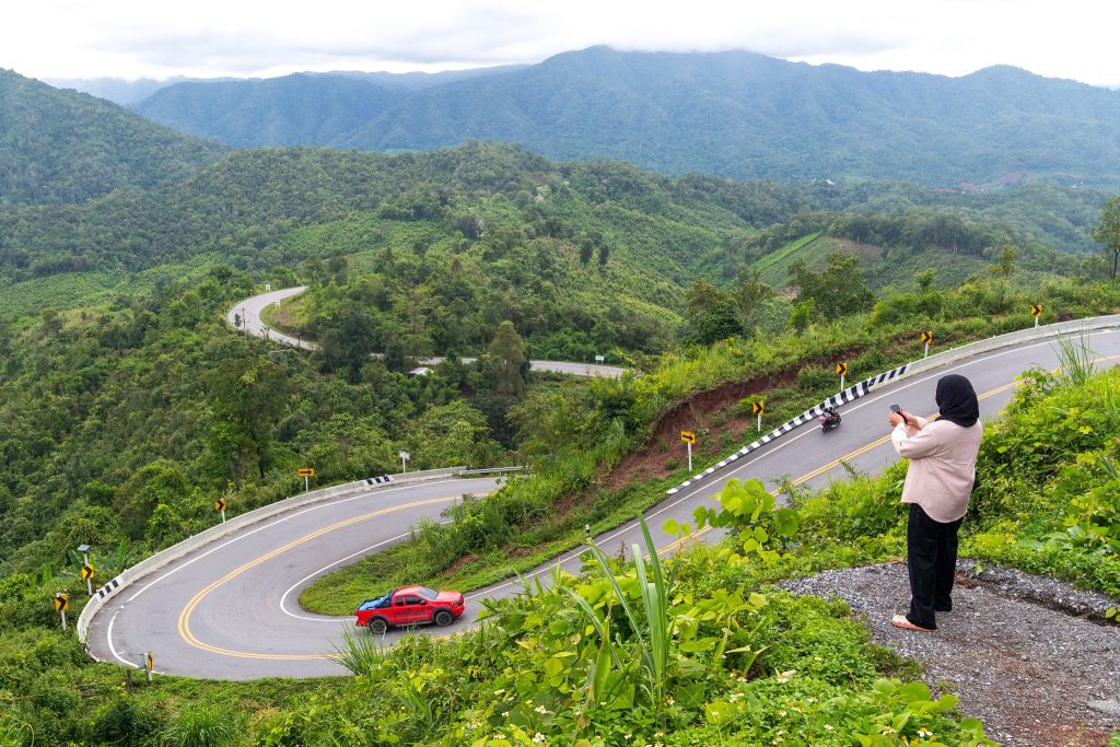 ขากลับเข้าตัวเมืองนาน อาจใช้ทางหลวงหมายเลข 1081 (บ่อเกลือ-สันติสุข) ซึ่งจะผ่าน “โค้งพับผ้า” อีกหนึ่งจุดชมวิวถนนที่สวยงาม รูปจากมุมโดรน จะเห็นความโค้งหักศอกของถนนที่ทบกันหลาย ๆ ชั้น เหมือนกองผ้าที่พับไว้