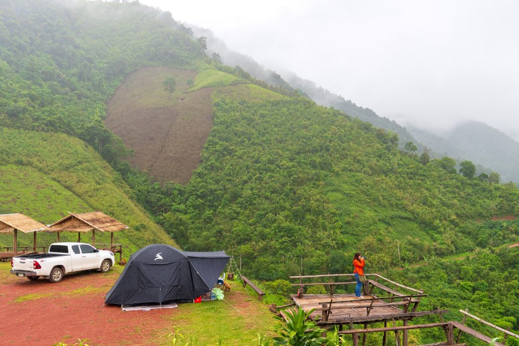ลานกางเต็นท์ส่วนกลางของบ้านห้วยหมีกับวิวภูเขาสีเขียวสุดอลังการ