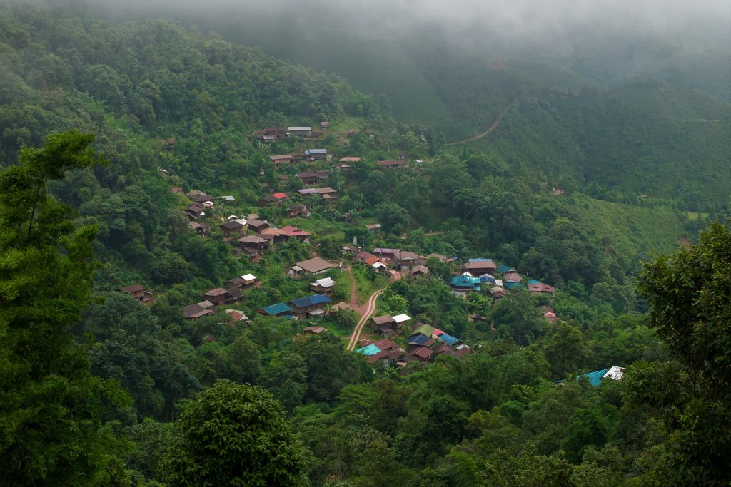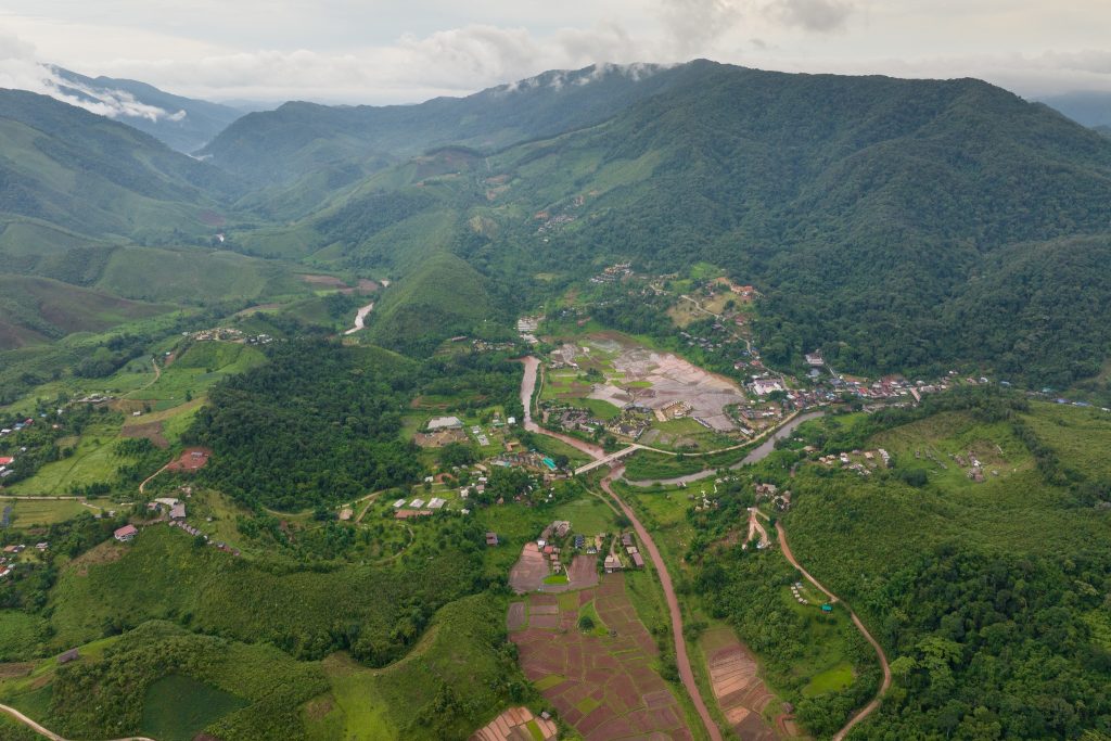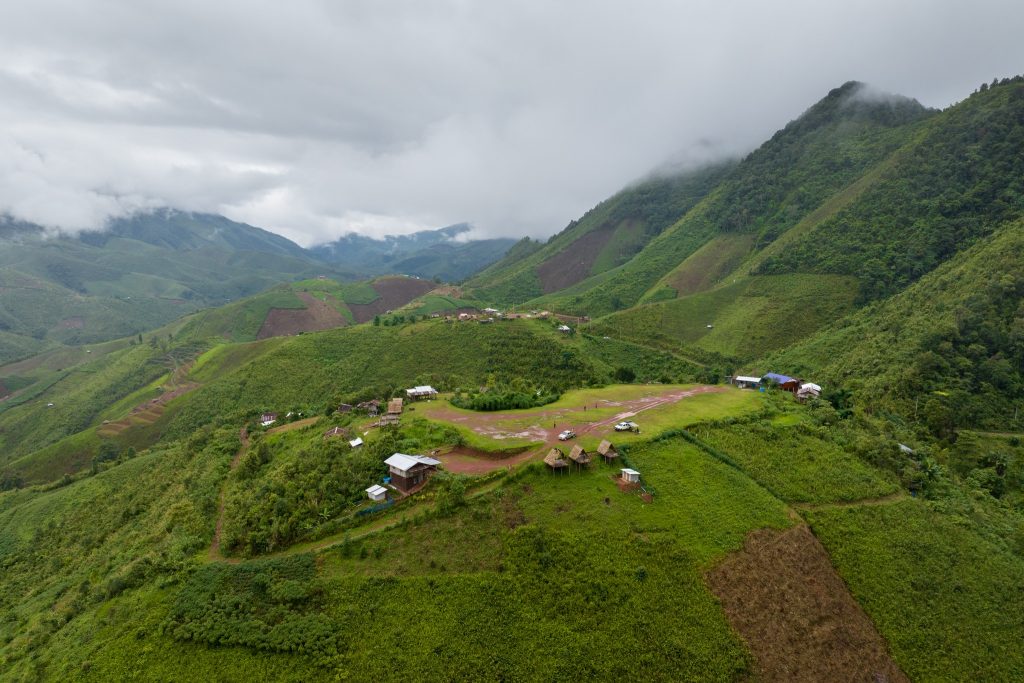 ทางตอนเหนือของบ้านสะปัน บนเทือกดอยสูงชันตรงกลางภาพ คือที่ตั้งของ “บ้านห้วยโทน” และ “บ้านห้วยหมี”