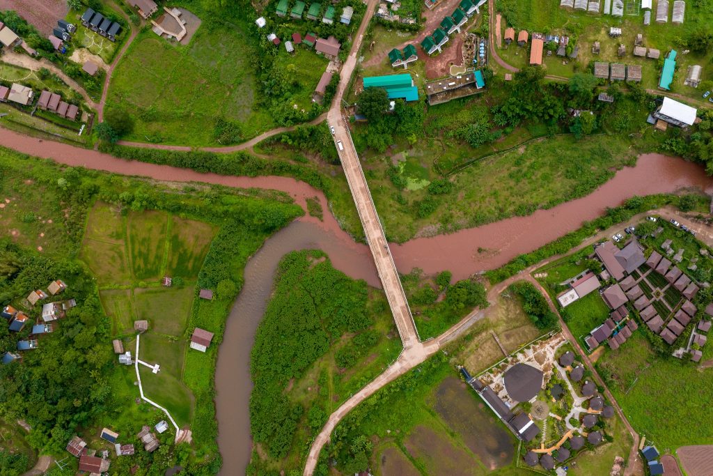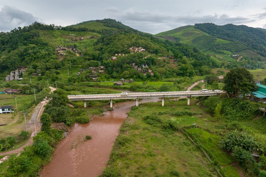 สะพานคอนกรีตอีกแห่งของบ้านสะปัน นอกจากใช้สัญจรไปมาแล้ว ยังเป็นจุดชมวิวที่สวยอีกแห่งของหมู่บ้าน บริเวณสะพานยังเป็นจุดบรรจบของลำน้ำ 2 สาย คือ ลำน้ำว้า (ทางฝั่งซ้าย) และลำน้ำมาง (ทางฝั่งขวา) ภาพจากมุมโดรนจะเห็นสีของน้ำที่ต่างกันชัดเจน เดาว่าช่วงก่อนหน้านี้พื้นที่ทางตอนเหนือของลำน้ำว้าน่าจะมีฝนตก จึงมีน้ำฝนชะล้างดินโคลนและไหลลงลำน้ำเยอะจนมีสีขุ่นแดงมากกว่าฝั่งของลำน้ำมาง