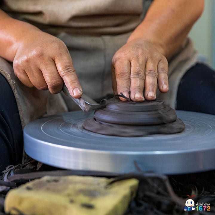 ภายในบริเวณบ้านดอยดินแดง เราจะได้เห็นกระบวนการผลิตเครื่องปั้นดินเผา ทั้งการปั้น การแต่งทรง การตาก การลงสี ฯลฯ รวมถึงได้เห็นเครื่องปั้นสวย ๆ ที่จัดวางอยู่ทั้งในและนอกอาคาร จากการเดินดู แอดรู้สึกได้เลยว่างานแต่ละชิ้นมีความงามในแบบของตัวเอง เป็นความงดงามในความสามัญ กลมกลืนกับบรรยากาศรอบข้าง สวยด้วยตัวของชิ้นงานเอง ไม่ได้ประกาศตัวให้ใครมาชมความงามของตน