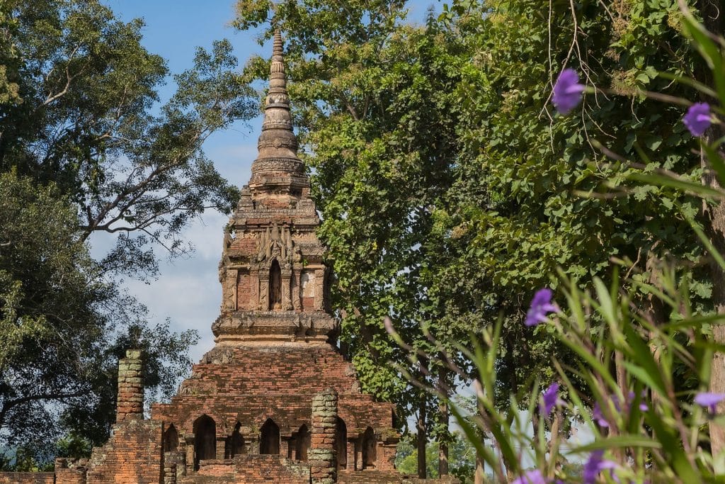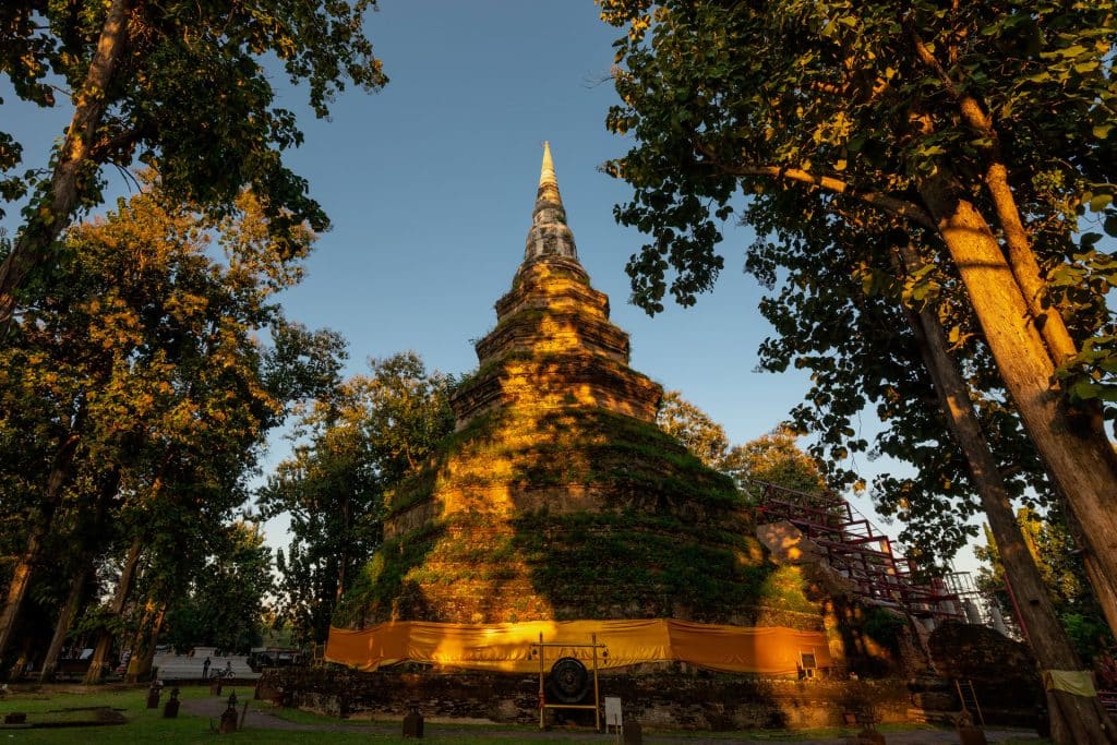 จากนั้นไกด์นำชมขับรถรางพาบัดดี้ไปที่ “วัดป่าสัก” ตั้งอยู่ด้านนอกกำแพงเมืองเชียงแสนทางด้านทิศตะวันตก สันนิษฐานสร้างขึ้นในปี พ.ศ. 1875 หลังจากที่พญาแสนภูสร้างกำแพงเมืองเชียงแสนเสร็จสิ้นแล้ว 4 ปี มีต้นสักล้อมรอบวัดกว่า 300 ต้น เจดีย์ประธาน มีลักษณะเป็นเจดีย์ทรงปราสาทยอด ผสมผสานศิลปะสุโขทัย พุกาม และหริภุญไชยเข้าด้วยกัน จนเป็นเอกลักษณ์เฉพาะตัว