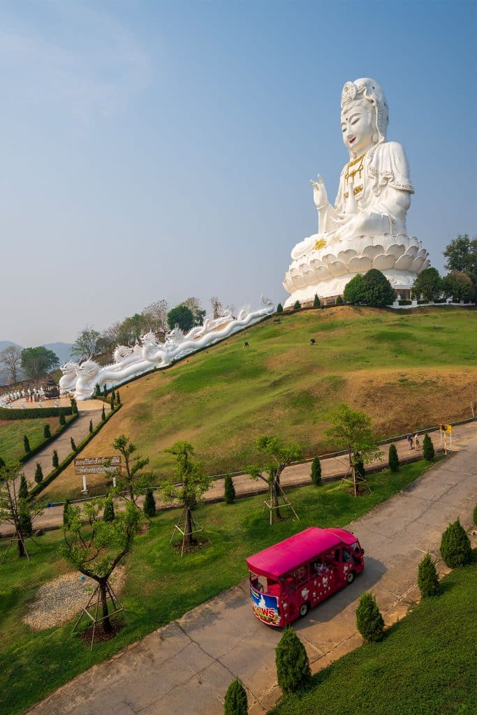 รูปปั้นพระโพธิสัตว์กวนอิม ถือเป็นองค์เจ้าแม่กวนอิมขนาดใหญ่ที่สุดในประเทศไทย มีความสูงประมาณ 79 เมตร ภายในองค์เจ้าแม่กวนอิมสามารถขึ้นลิฟต์เพื่อชมวิวจากมุมสูงได้ ผนังด้านในเป็นลวดลายปูนปั้นสวยงาม