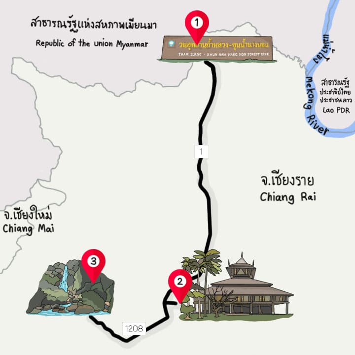 วนอุทยานถ้ำหลวง – ขุนน้ำนางนอน ตั้งอยู่ในเขตป่าสงวนแห่งชาติป่าดอยนางนอน ตำบลโป่งผา อำเภอแม่สาย จังหวัดเชียงราย ลักษณะภูมิประเทศเป็นภูเขาหินปูนขนาดใหญ่หลายลูกทอดตัวต่อกันในแนวเหนือ-ใต้ โดยลาดชันมาทางทิศตะวันออก มีลักษณะคล้ายกับผู้หญิงนอน จึงเรียกกันโดยทั่วไปว่า “ดอยนางนอน” ในส่วนของถ้ำหลวงมีความยาวถึง 10.3 กิโลเมตร
