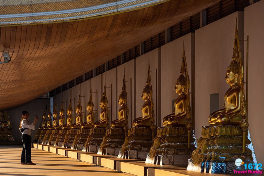 ภายนอกพระอุโบสถมีระเบียงคด ซึ่งประดิษฐานสมเด็จองค์ปฐมและพระพุทธเจ้า 28 พระองค์ ตลอดจนรูปหล่อพระพุทธรูปหน้าตัก 4 ศอกยาวตลอดแนวกำแพง สามารถเดินชมความงามพร้อมสักการะ หรือเดินทำสมาธิได้