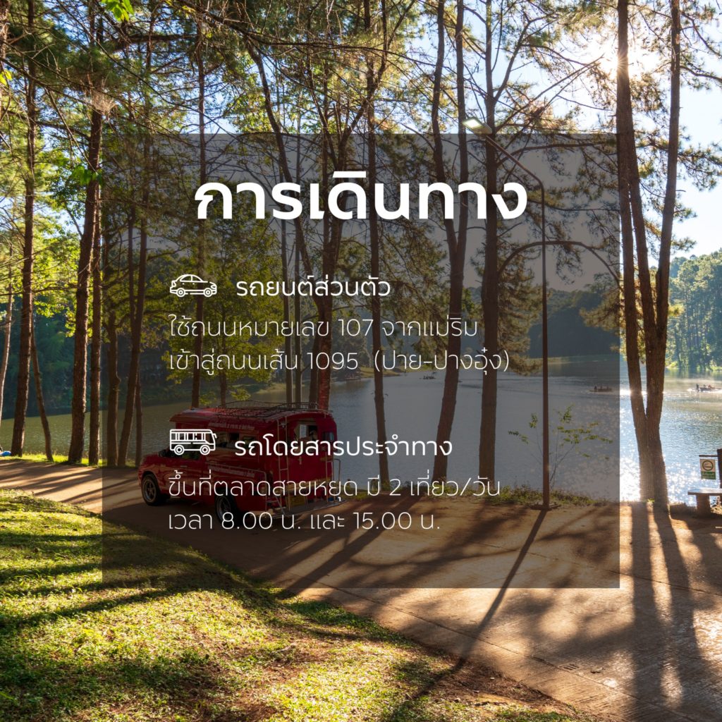 • รถยนต์ส่วนตัว ใช้ถนนหมายเลข 107 จากอำเภอแม่ริม จังหวัดเชียงใหม่เข้าสู่ถนนเส้น 1095 ผ่านอำเภอปายมายังปางอุ๋ง จังหวัดแม่ฮ่องสอน