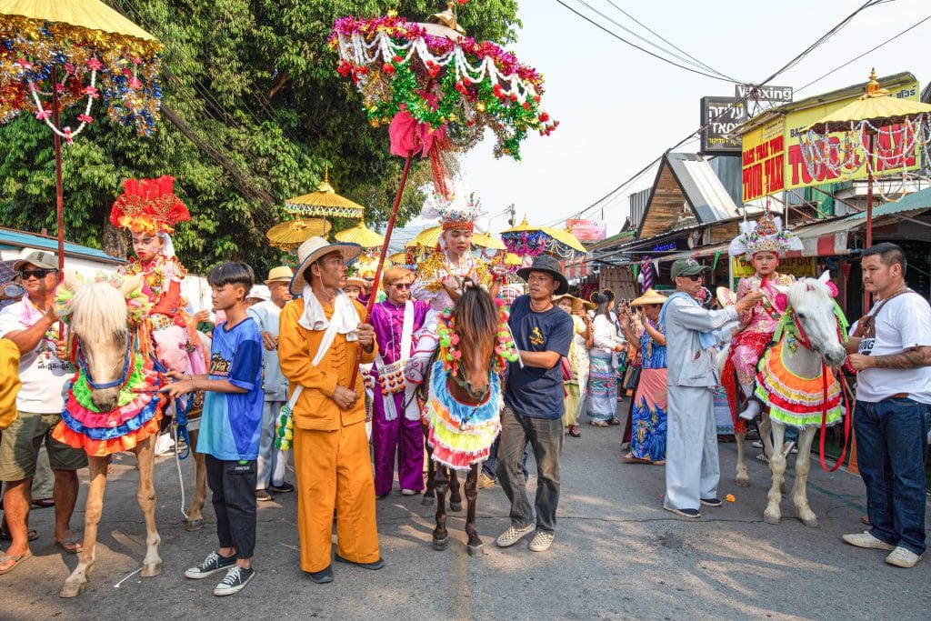 เมื่อถึงกำหนดจัดงานจะมีการโกนผมส่างลอง แต่จะไม่โกนคิ้ว (เพราะพระภิกษุพม่าไม่โกนคิ้ว) แล้วแต่งกายอย่างสวยงามด้วยเครื่องประดับอันมีค่า เช่น สวมสายสร้อย กำไล แหวน และใช้ผ้าโพกศีรษะแบบพม่า สวมถุงเท้ายาว นุ่งโสร่ง ทาแป้งขาว เขียนคิ้ว ทาปาก จากนั้นพาไปขึ้นขี่บนหลังม้า ถ้าไม่มีม้าก็จะขี่คอคน ซึ่งเรียกว่า “พี่เลี้ยง” หรือ “ตะแปส่างลอง” แล้วแห่ไปตามถนนสายต่าง ๆ มีกลดทองหรือ “ทีคำ” แบบพม่า กางเพื่อกันแดด