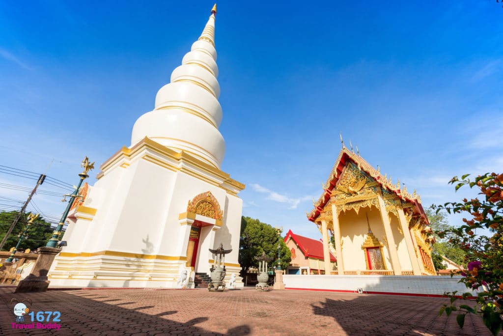 จุดเด่นก็คือเจดีย์ทรงบาตรคว่ำสีขาว เรียงซ้อนกัน 5 ชั้น ด้านในมีจิตรกรรมฝาผนังพุทธประวัติ ซึ่งจะเปิดให้เข้าชมเฉพาะวันพระเท่านั้น
