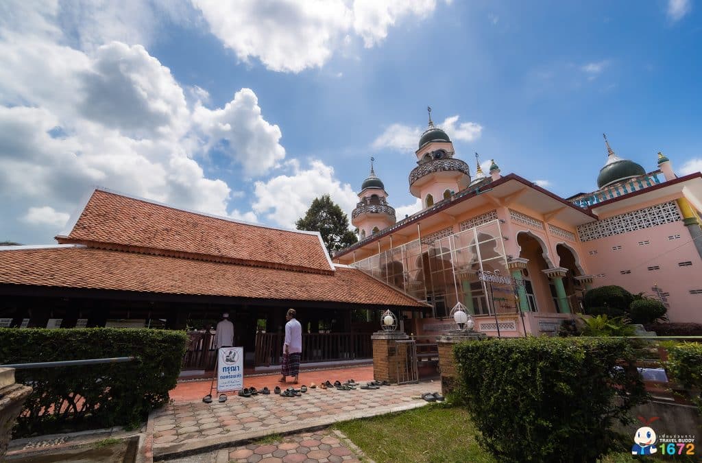 ไม่ไกลจากวัดทรายขาว มีมัสยิดเก่าแก่อายุกว่า 300 ปี ที่ผสมผสานสถาปัตยกรรมระหว่างไทยและมุสลิม เป็นมัสยิดไม้ที่สร้างขึ้นโดยไม่ใช้ตะปู ใช้เพียงไม้เป็นสลักในการยึดแต่ละส่วนเข้าด้วยกัน ออกมาเป็นรูปแบบศาลาการเปรียญ ไม่มีโดม แตกต่างจากมัสยิดที่พบเห็นกันทั่วไป ซึ่งมัสยิดแห่งนี้เป็นการออกแบบร่วมกันระหว่างพระครูศรีรัตนากร หรือพ่อท่านศรีแก้ว เจ้าอาวาสวัดทรายขาวในสมัยนั้น กับโต๊ะอิหม่าม เป็นการยืนยันถึงความสัมพันธ์อันดีระหว่างชาวบ้านทั้งสองศาสนาในชุมชน ซึ่งสะท้อนผ่านวัฒนธรรมการอยู่ร่วมกันมาอย่างยาวนาน