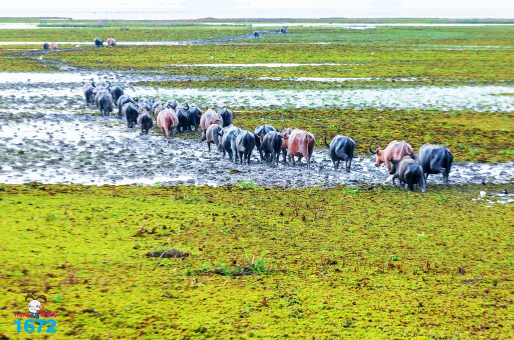 ฝูงควายน้ำพากันเดินเรียงแถวมุ่งสู่เวิ้งน้ำเบื้องหน้า เป็นภาพที่สร้างความประทับใจให้กับนักท่องเที่ยวไม่น้อย
