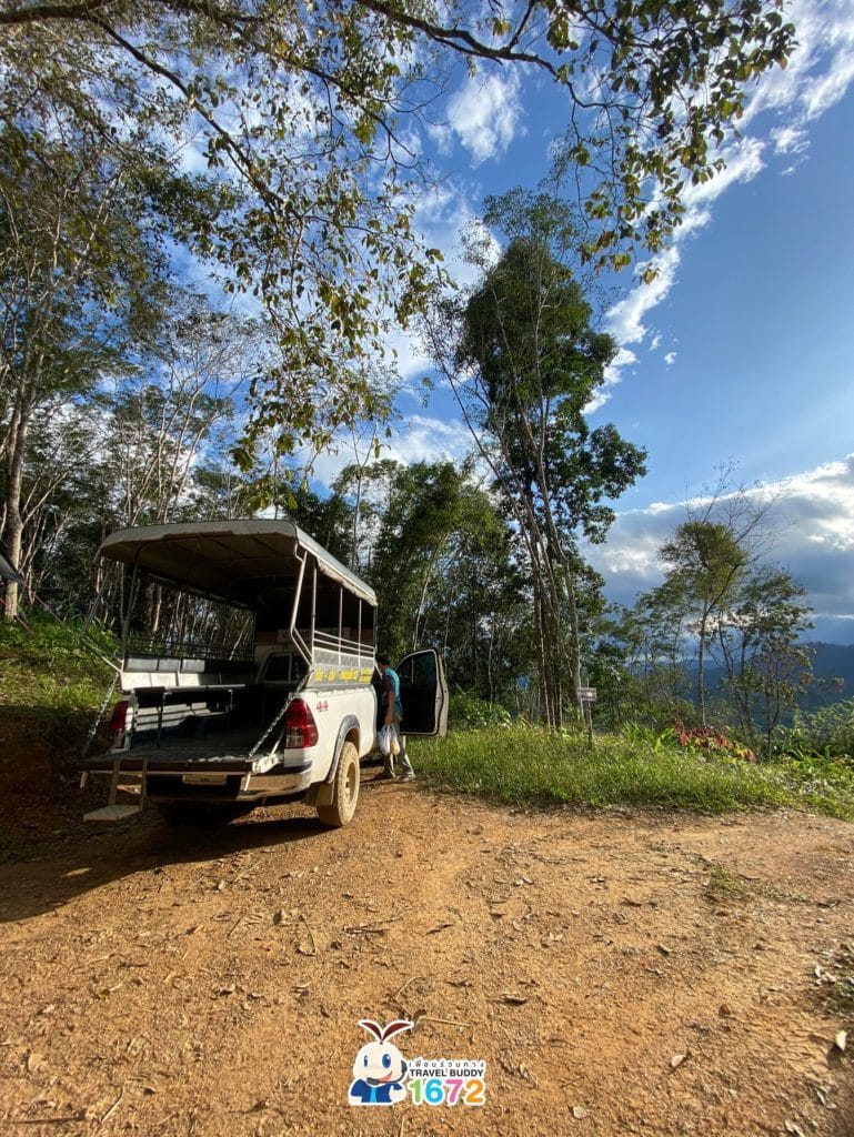 - เส้นทางที่ 1 นั่งรถโฟร์วีลขึ้นไป 3 กิโลเมตรและเดินเท้าต่ออีก 2 กิโลเมตรไปยังจุดกางเต็นท์ โดยรถโฟร์วีลจะมารอรับที่ร้านก๋วยเตี๋ยวกะลาในหมู่บ้าน ที่พิกัด กม.28 (https://goo.gl/maps/MfVasb7y1wYa6JiN9) ถ้าเพื่อน ๆ คนไหนชอบท้าทายกำลังขาของตัวเองสามารถเลือกเส้นทางนี้ได้นะคะ