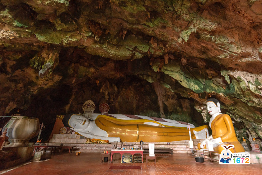 ภายในถ้ำ มีโถงที่กว้างขวาง เต็มไปด้วยพระพุทธรูปเก่าแก่ ที่เด่นที่สุดก็คือ พระพุทธรูปปางไสยาสน์ขนาดใหญ่ ความยาว 81 ฟุต 1 นิ้ว ชาวบ้านเรียกว่า พ่อท่านบรรทม ซึ่งเป็นองค์ที่มีการบูรณะขึ้นใหม่ โดยสร้างทับองค์เดิมที่สร้างจากโครงไม้ไผ่สานเป็นตะแกรงโบกด้วยดินดิบ บริเวณหลังองค์พ่อท่านบรรทม มีรูปปั้นพญานาคทอดตัวแผ่พังพานอยู่เหนือเศียร
