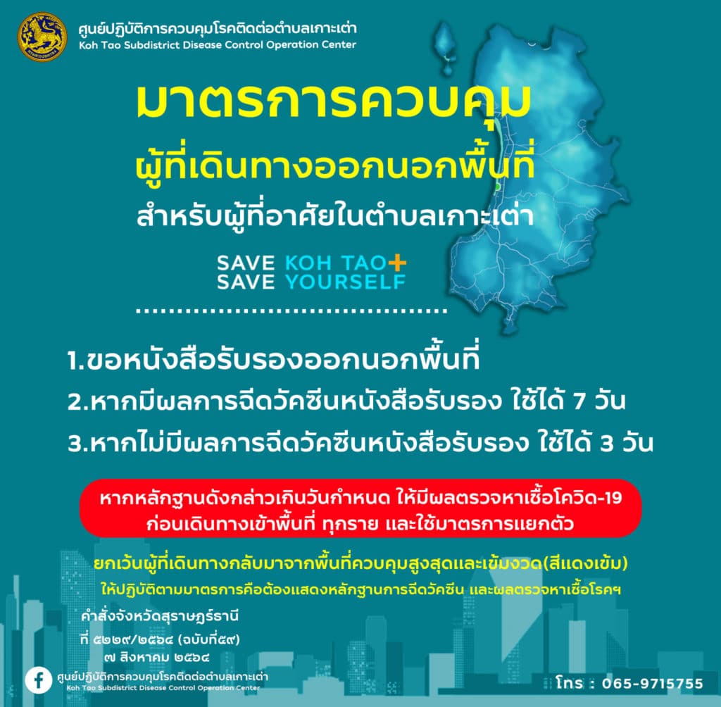 ตามคำสั่งจังหวัดสุราษฎร์ธานี เรื่อง มาตรการเร่งด่วนในการป้องกันการแพร่ระบาดของโรคติดเชื้อไวรัสโคโรนา 2019 ฉบับที่ 59 พื้นที่อำเภอเกาะสมุย-อำเภอเกาะพงัน ลงวันที่ 6 สิงหาคม 2564