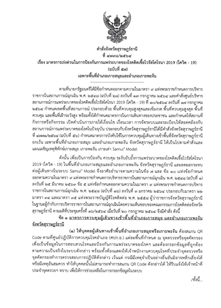 📌คำสั่งจังหวัดสุราษฎร์ธานี ที่ ๔๗๙๘/๒๕๖๔ (ฉบับที่ ๕๗)