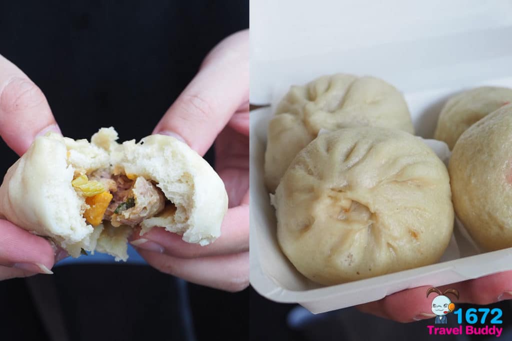 The hand-shaped buns are made from dough mixed with sweet potatoes. The price starts from 20 Baht a piece depending on the fillings.
