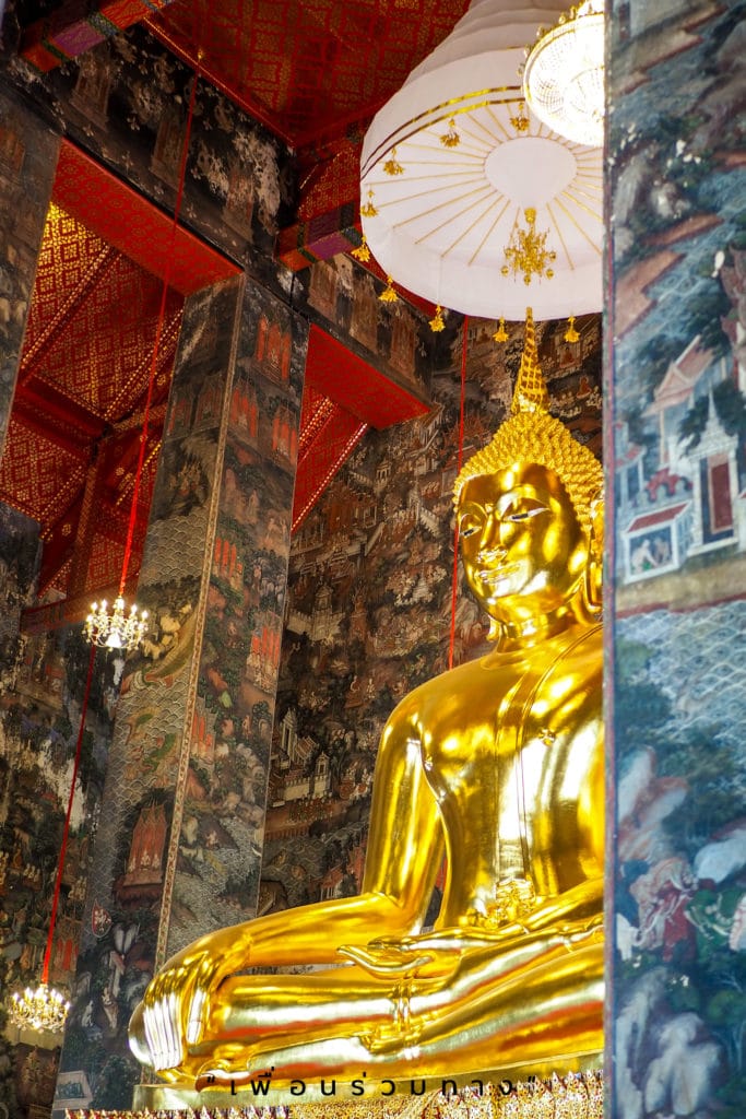 The principal Buddha image of Wat Suthat, Phra Sri Sakayamuni, is Thailand’s largest bronze seated Buddha image in the gesture of subduing Mara. The 8-metre-high statue was brought all the way from Wat Maha That of Sukhothai province. 😮
