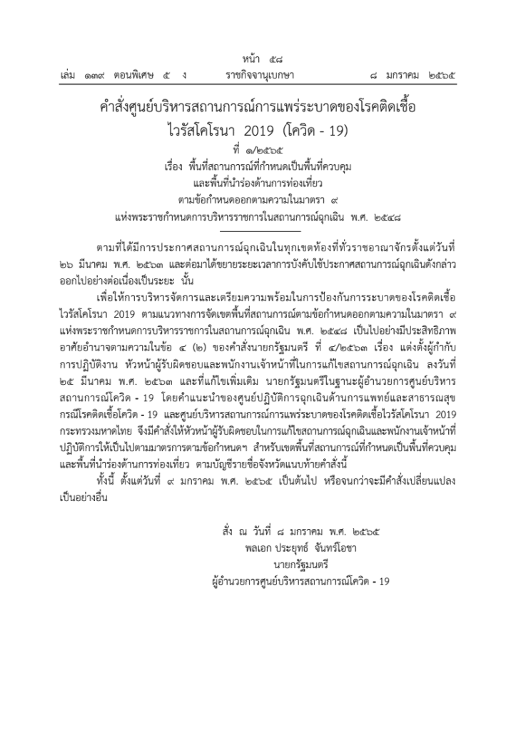 คำสั่งศูนย์บริหารสถานการณ์การแพร่ระบาดของโรคติดเชื้อไวรัสโคโรนา 2019 (โควิด – 19) ที่ 1/2565