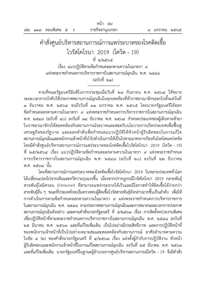 คำสั่งศูนย์บริหารสถานการณ์การแพร่ระบาดของโรคติดเชื้อไวรัสโคโรนา 2019 (โควิด – 19) ที่ 1/2565 และ 2/2565